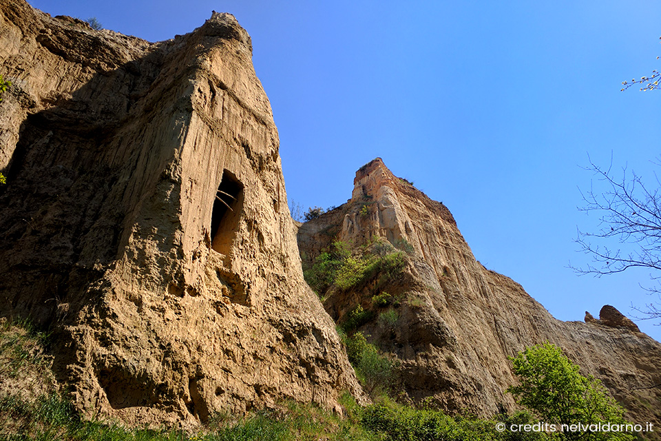 Soffermatevi un momento e ammirate questo capolavoro naturale. L’erosione dei sedimenti dell’antico lago pliocenico, che si trovava nel Valdarno, ha creato immense e magnifiche strutture che, come sappiamo, non dureranno per sempre. Da questo punto è possibile fare qualche altro passo all’interno del bosco per ammirare questa piccola cresta.